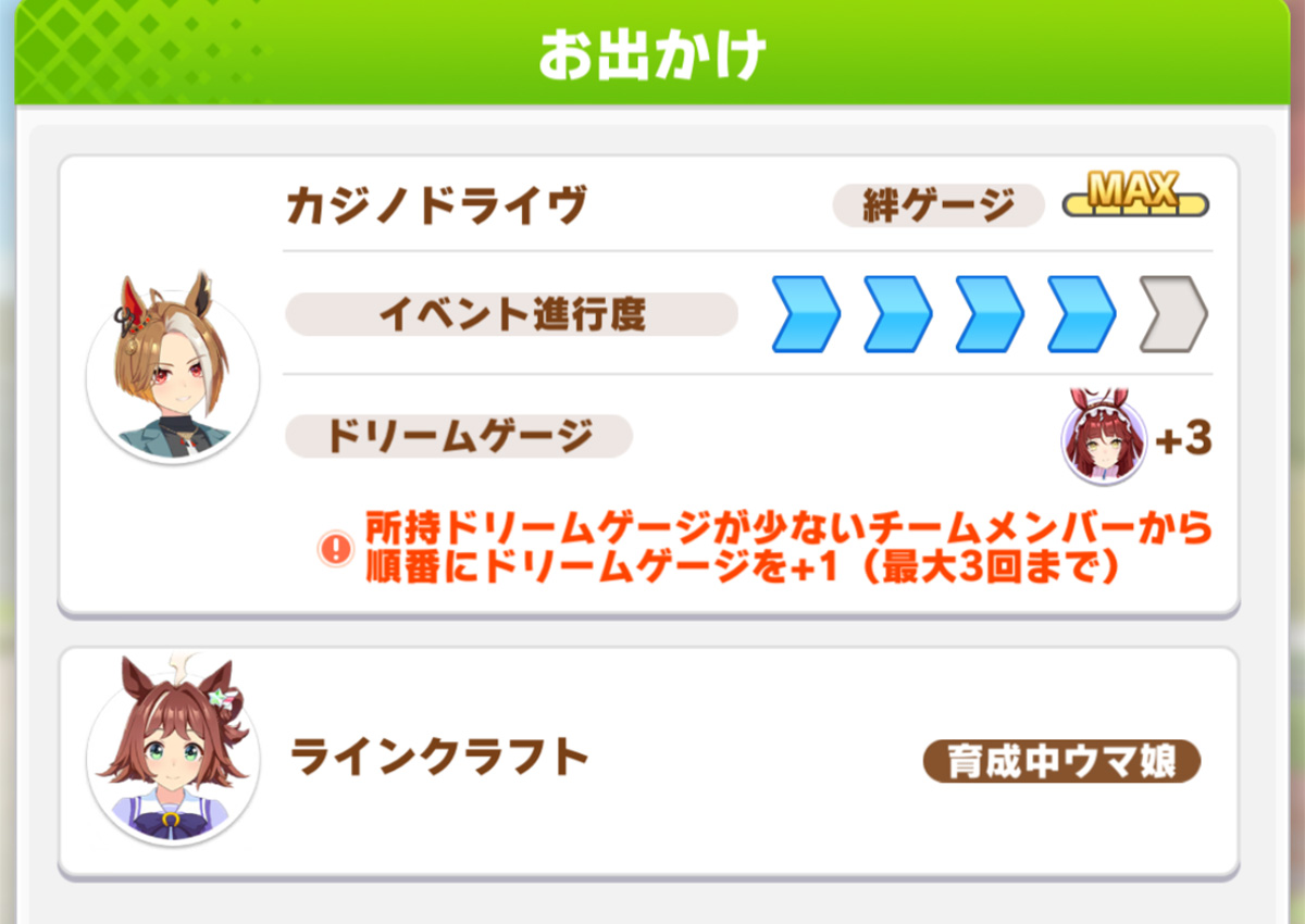 カジノ「お出かけ」は練習が弱いときなどに消化。遅れた1人が+3ゲージになる形が理想。