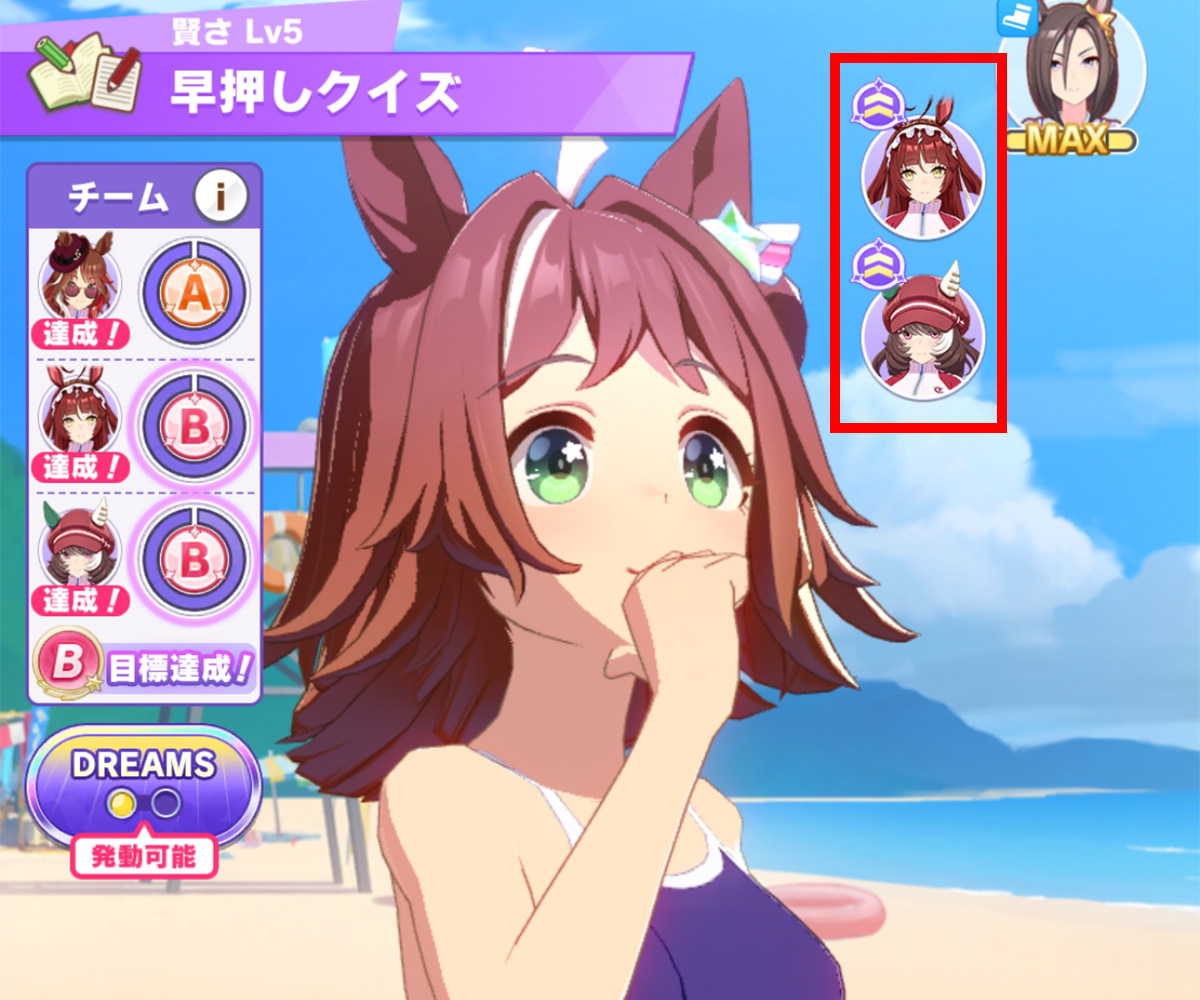 このシナリオでは、ドリームゲージMAXの「紫」アイコン時には、トレーニング効果30%アップの効果がつきます。(以下、爆発)