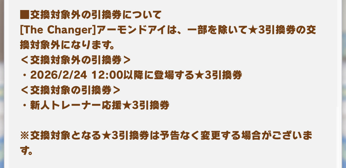 アーモンドアイですが、公式のお知らせでいわゆる通常の★3引換券では交換不可の「限定ウマ娘」であることが明らかになっています。ステイゴールドとかスティルインラブとかと同じやつですね。