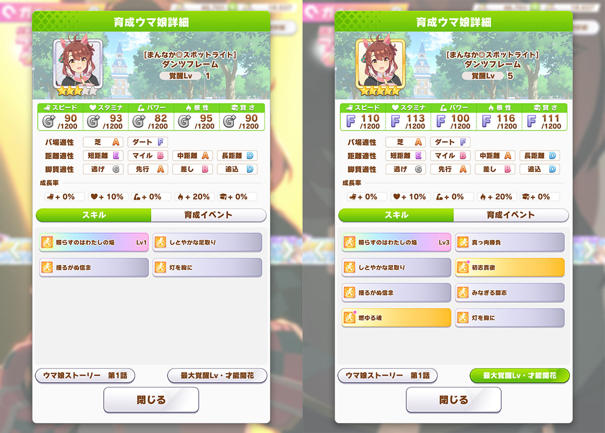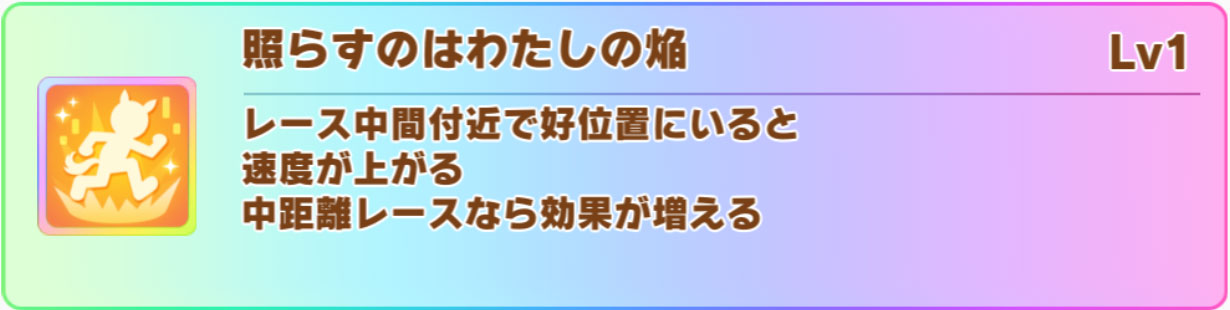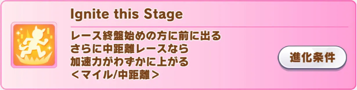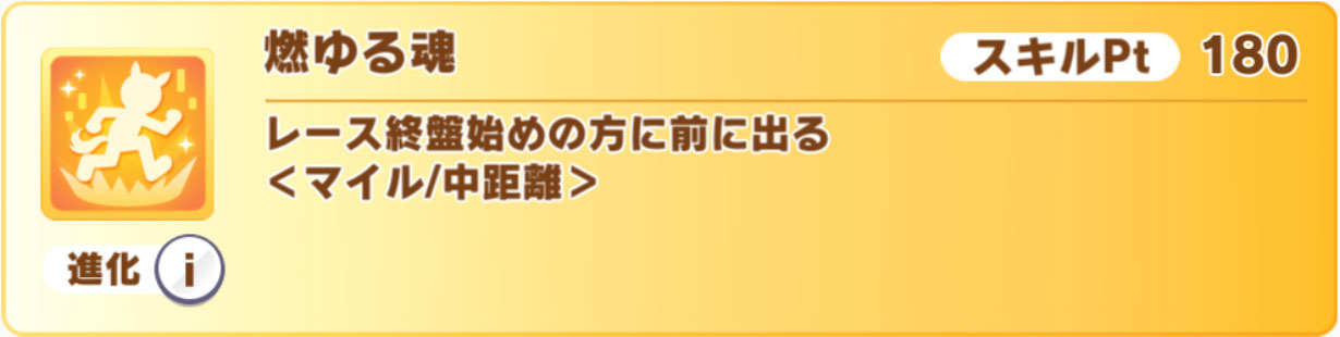 覚醒Lv5はマイル/中距離専用の終盤現在速度スキル「燃ゆる魂」で、進化スキルは中距離限定の加速力アップがついた「Ignite this Stage」。
