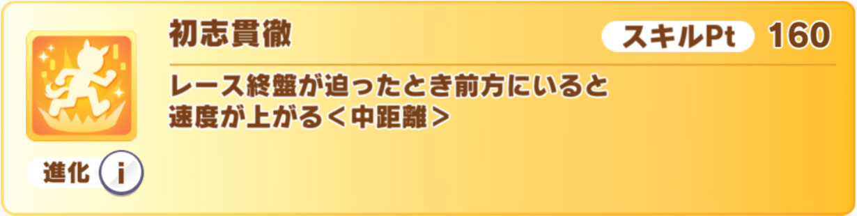 覚醒Lv3は中距離専用の中盤スキル「初志貫徹」で、進化スキルは先行専用になりつつ、中距離追い比べ時の追加効果が加わった「わたしだって、勝ちたい!!」。
