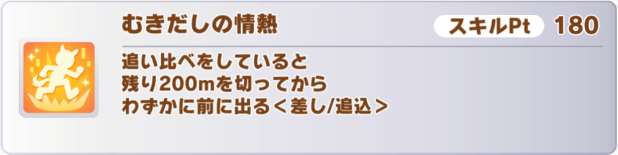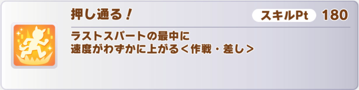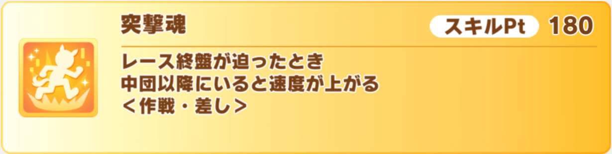 金スキルは2種を一度に獲得できるタイプで、1個目は差し専用の速度スキル「突撃魂」です。
