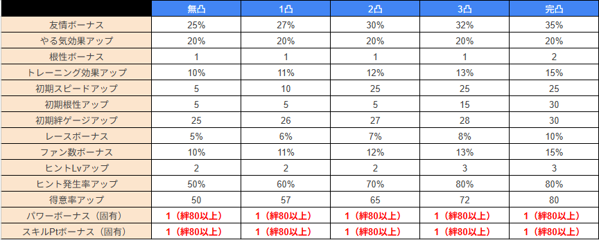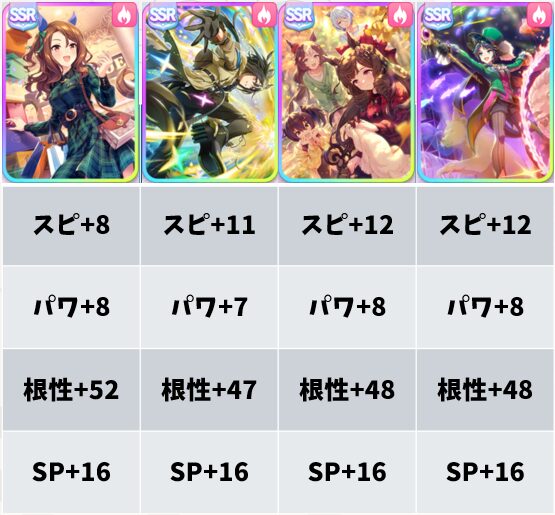 一応、完凸だと根性ボーナス2がつくので、伸ばせるなら一応伸ばしておいたほうがいいぐらいでしょうか。そこまでこのサポートに突っ込めるという人もそんなに多くはなさそうですが……。