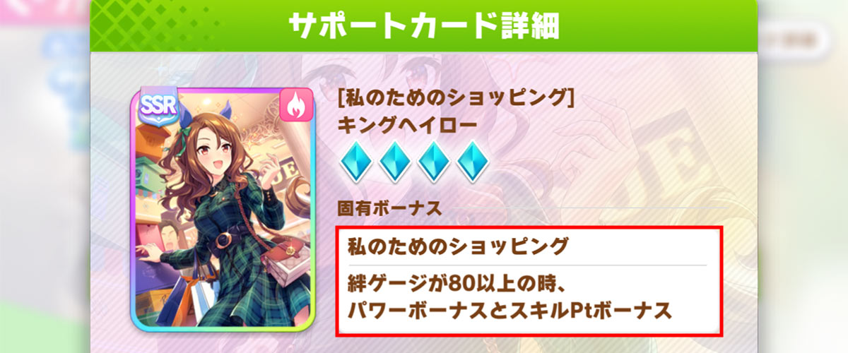 SSRキングヘイロー(根性)の固有ボーナスは、「絆ゲージが80以上の時、パワーボーナス1とスキルPtボーナス1」です。