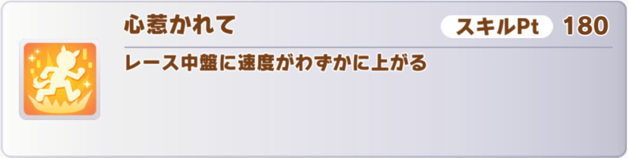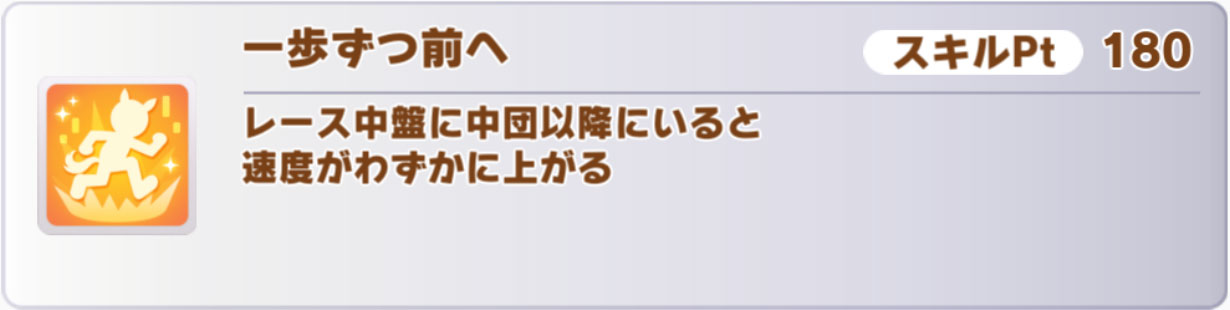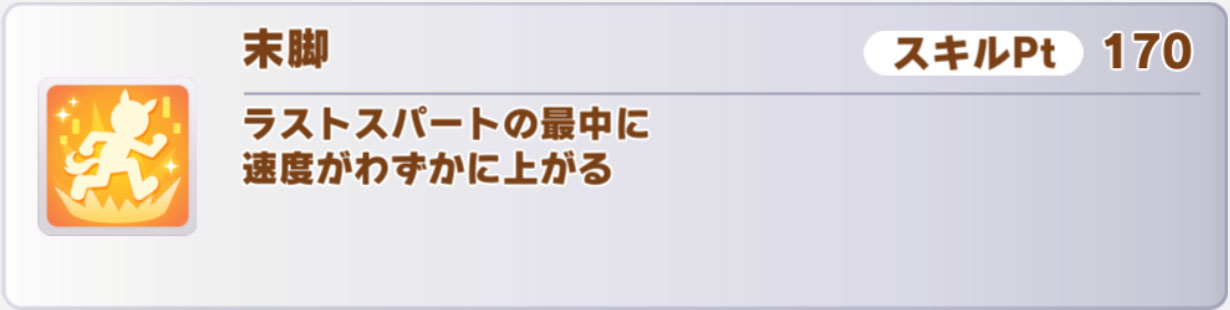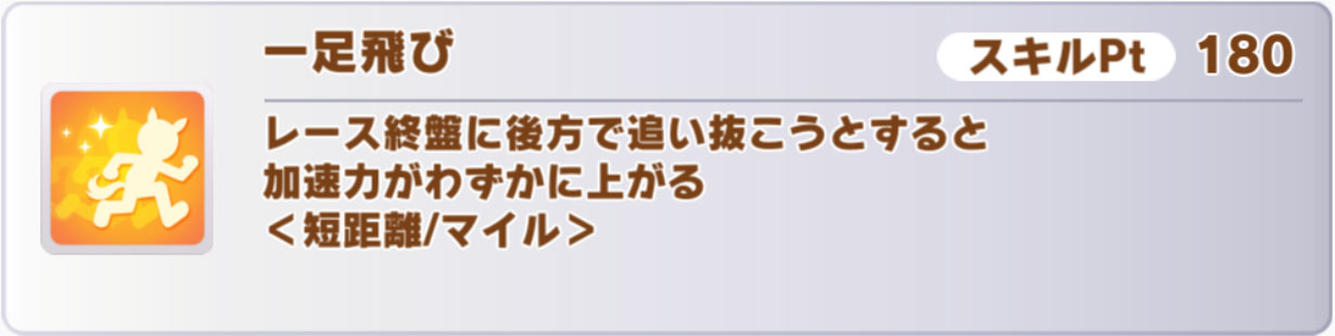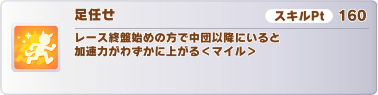 特筆すべき点としては、マイル専用の終盤1/4加速「足任せ」を取れることでしょうか。このスキルを取る手段はかなり少ないので、因子周回的にも貴重です。