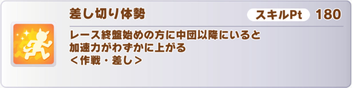 具体的には「差し直線◯」「十万バリキ」「差し切り体勢」などのスキルを狙えますね。