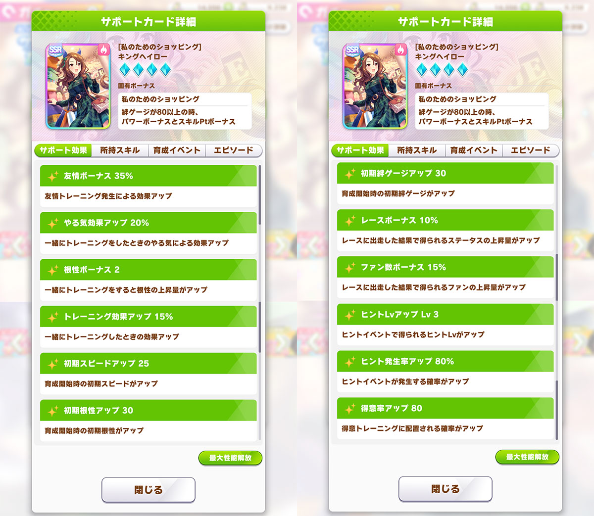 最近の強サポートはスキルPtボーナス2が当たり前の時代なので、これはうーんとなってしまいますね。その他はヒントLvアップ Lv3など悪くないですが、強くもないなという感想です。