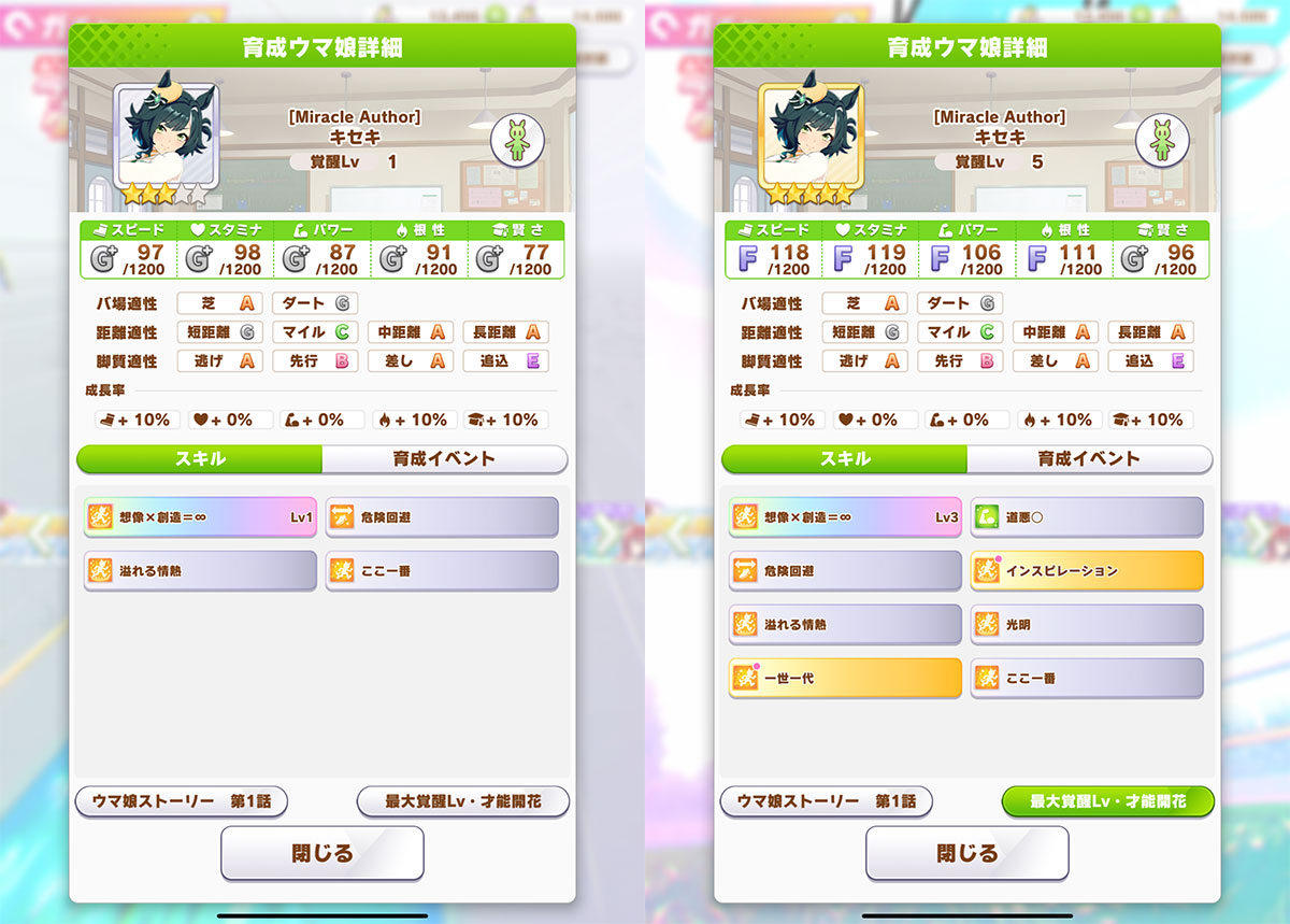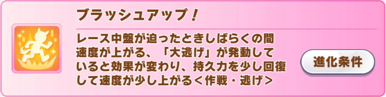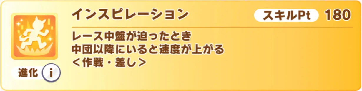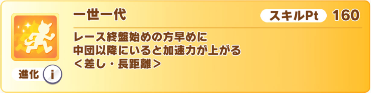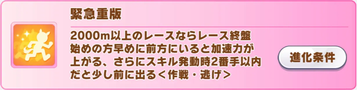 覚醒Lv5は「ここ一番」の上位スキルとなる差し・長距離専用の終盤1/8加速「一世一代」で、進化スキルは発動する距離の範囲が広がりつつ、逃げ専用&追加効果つきになった「緊急重版」。