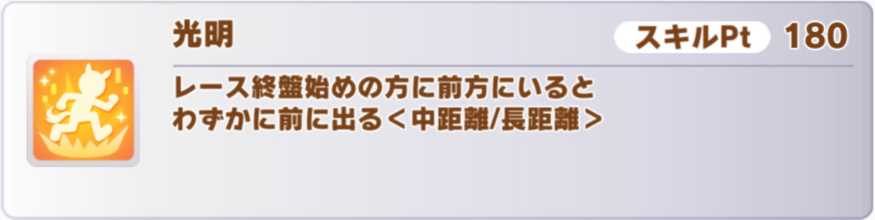 逃げ運用なら中距離でも使えますし、2番手以内の追加効果はかなり満たしやすいはず。比較的強めのスキルかと思います。