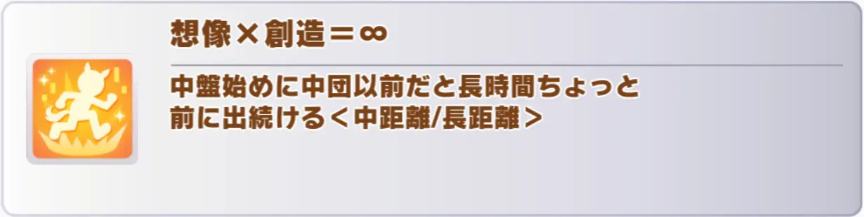 発動条件:レース終盤始め1/4区間のランダムな地点で、順位が上位50%以内(チャンミ:1~5位)(LoH:1~6位)<中距離/長距離>