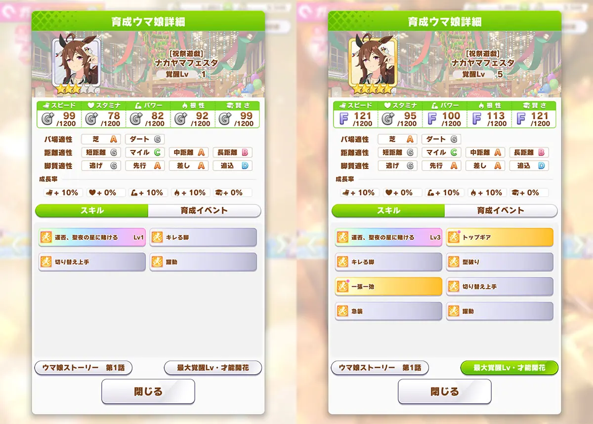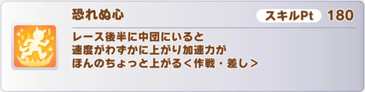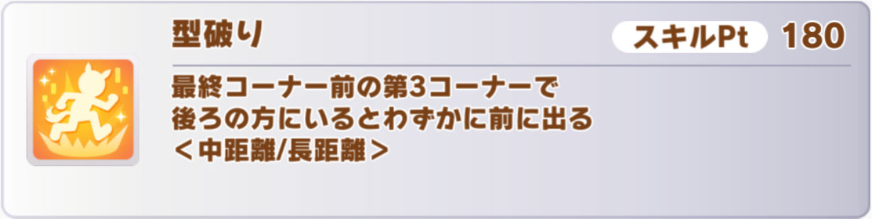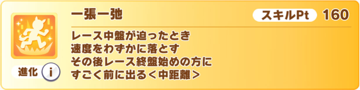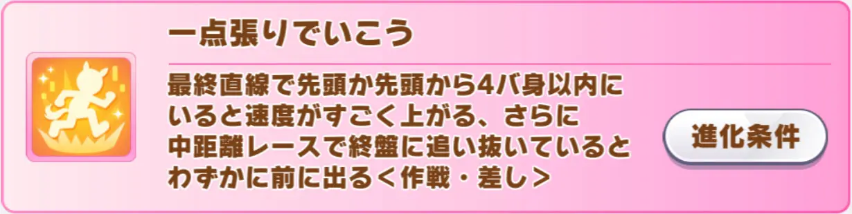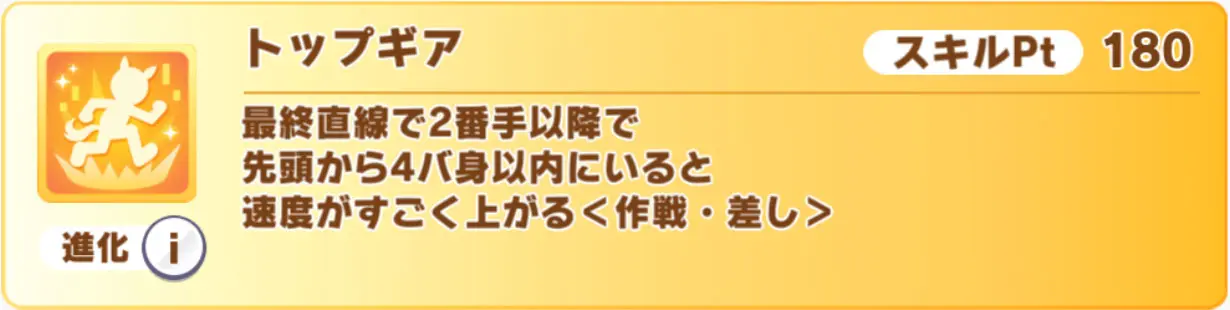 スキルが発動するぐらい前に上がれば追い抜き条件は満たせていると思うので、なかなか強めの進化スキルかと。ただ、キャラ自体は中長距離で使えるのに、このスキルが中距離でしか強くならないのはちょっと惜しいか。