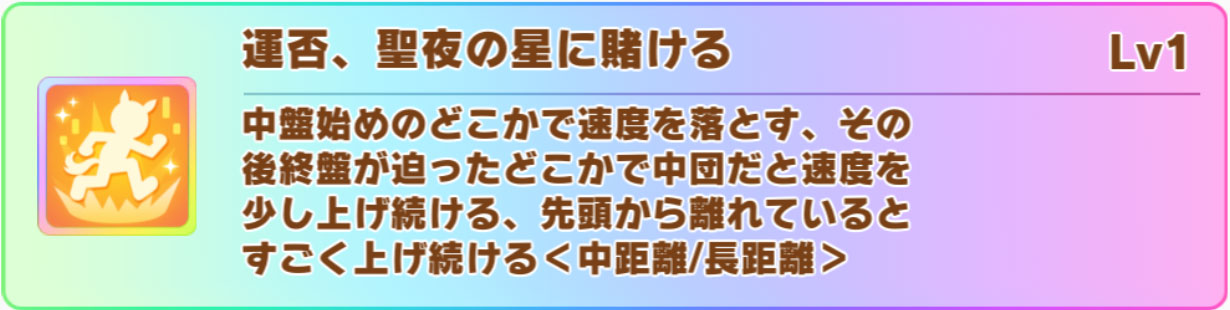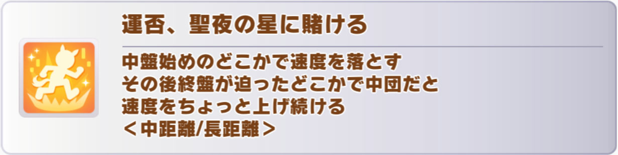 ナカヤマフェスタ(クリスマス・新衣装)の固有スキル「運否、聖夜の星に賭ける」は、レース中盤前半で速度ダウン、中盤後半で速度アップするというスキルになります。