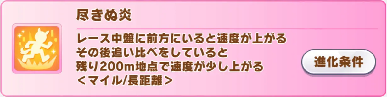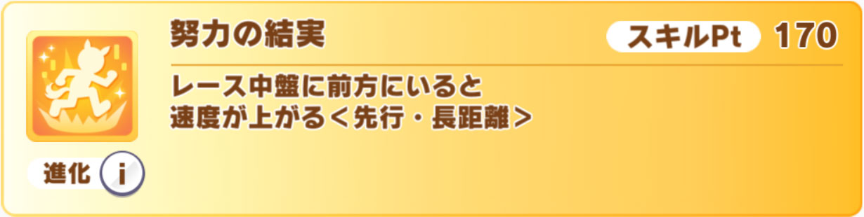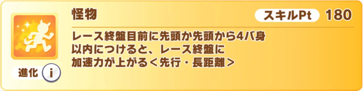 発動条件:レース終盤目前に1位or1位から4バ身差以内の条件を満たすと、レース終盤に発動<先行・長距離>