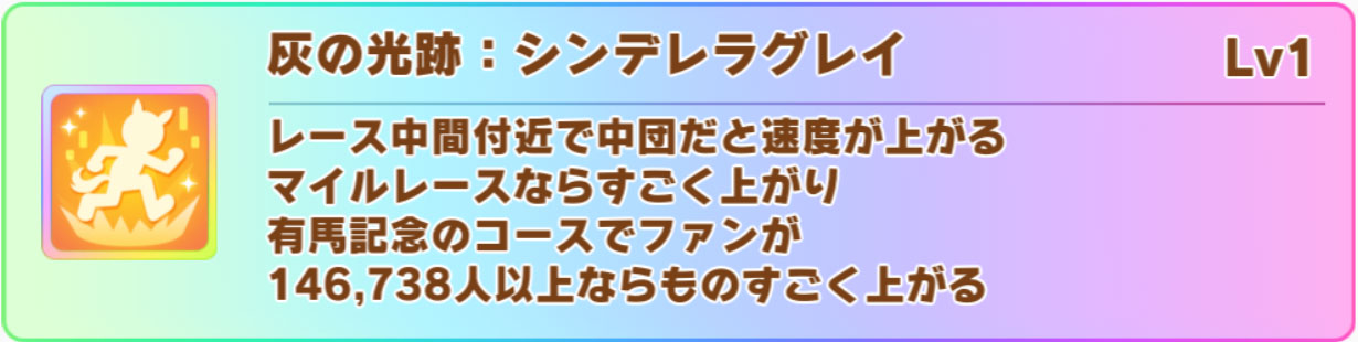 オグリキャップ(シングレ・新衣装)の固有スキル「灰の光跡:シンデレラグレイ」は、レース中間付近で発動する速度スキルです。