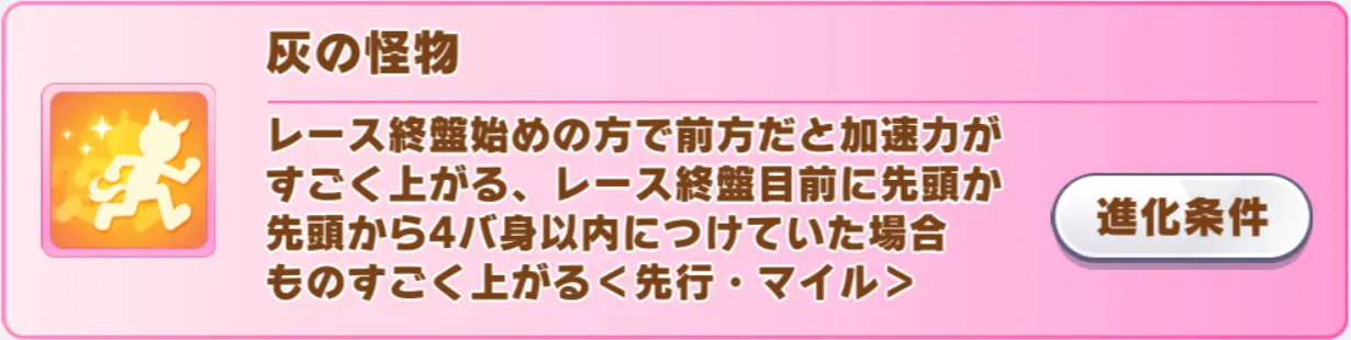 2個目の「灰の怪物」は、先行・マイル専用となっており、終盤始め1/4ランダムの加速となっています。