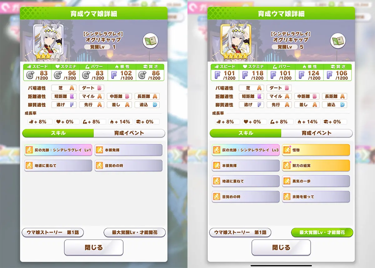 覚醒Lv3は先行・長距離専用の新スキル「努力の結実」で、進化スキルは追い比べ時の残り200m速度アップが加わった「尽きぬ炎」。