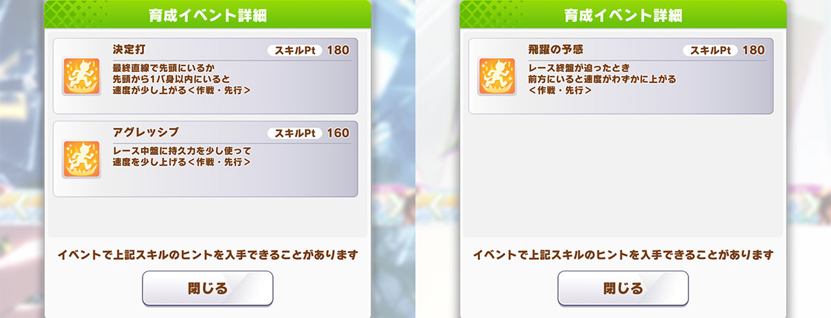 加えて,強キャラにはおなじみの固有「切れ者」イベント持ち。さらに、勝負服イベントでは「決定打」「アグレッシブ」「飛躍の予感」などのスキルも狙えます。