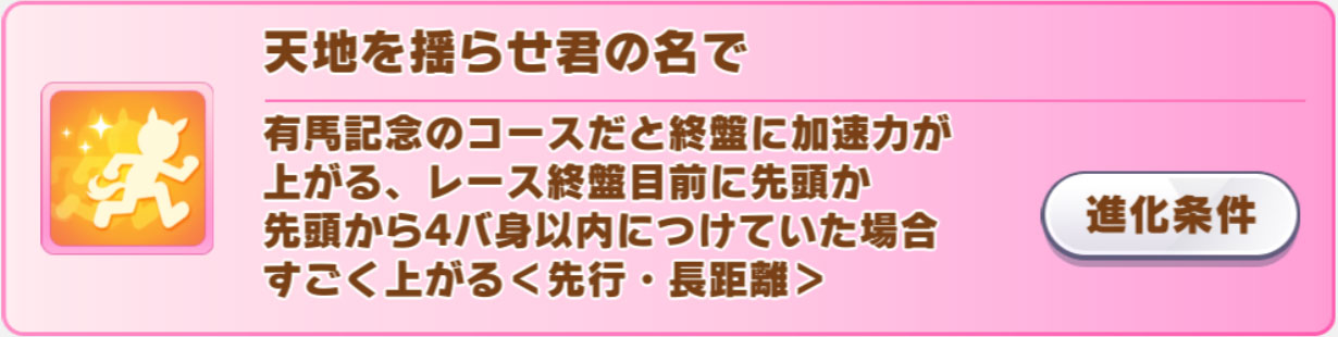 覚醒Lv5は先行・長距離用の終盤加速「怪物」で、進化スキルは2種類に分岐するタイプ。 1個目は、有馬記念のコースだけで発動する「天地を揺らせ君の名で」です。