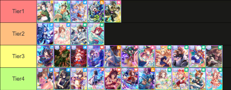 あとは、10月チャンミで活躍したSSRダイイチルビーも強いんですが、単純に短距離レースイベントが現環境でなさそうという理由で、今回のTier表からは外しました。