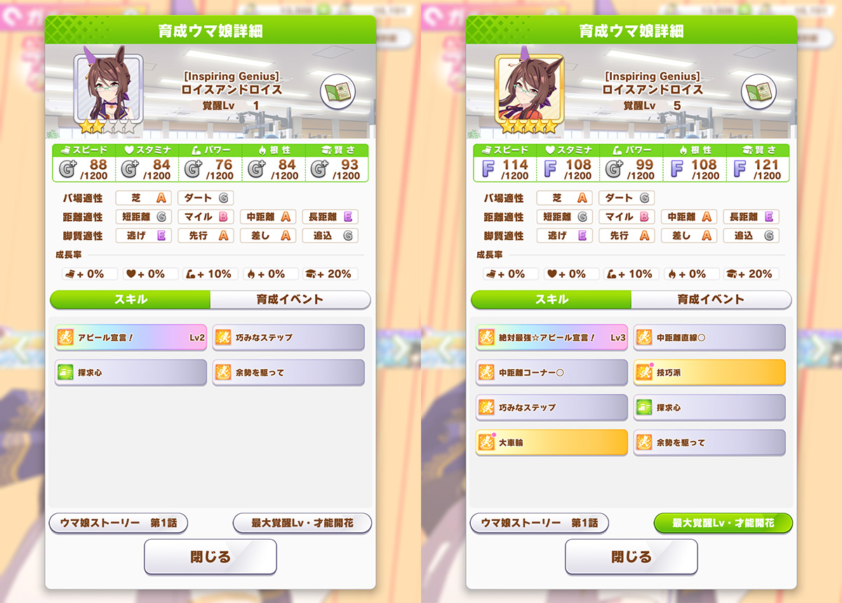 覚醒Lv5は「余勢を駆って」の上位スキルとなる上り坂速度スキル「大車輪」で、進化スキルはすごく速度になった「認知度、急上昇!」。