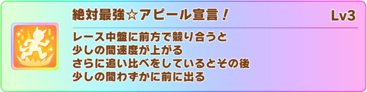 進化前はほぼ使えないスキルでしたが、進化によって上振れれば強いこともあるスキルとなりました。基本的に微妙ですが、第3コーナーで終盤入りする中距離とかでは、ワンチャン貴重な加速になるかもしれません。