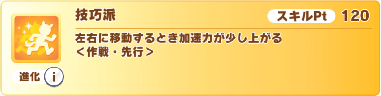 覚醒Lv3は「巧みなステップ」の上位となる加速スキル「技巧派」で、進化スキルはレース後半コーナー発動になりつつ現在速度効果がついた「天才的技巧」。