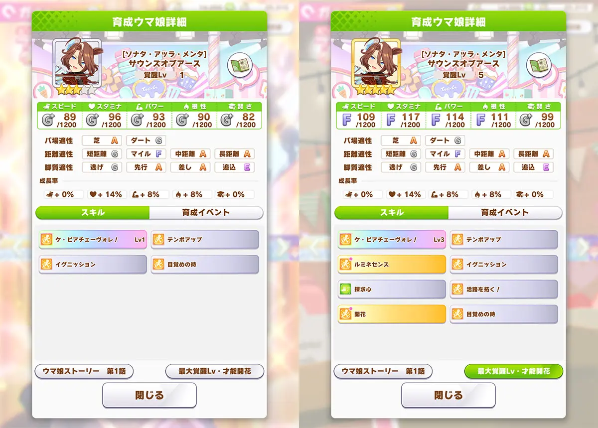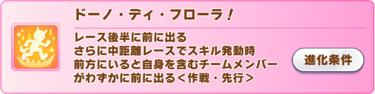 覚醒Lv5は順位条件を満たすと現在速度になる先行中盤スキル「開花」で、進化スキルはまったく異なるレース後半バフスキルになった「ドーノ・ディ・フローラ!」。