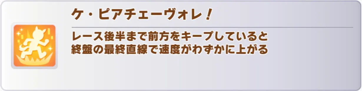 サウンズオブアース(バレンタイン・新衣装)の固有スキル「ケ・ピアチェーヴォレ!」は、レース後半までに上位50%以内を維持することが必要な終盤スキルです。