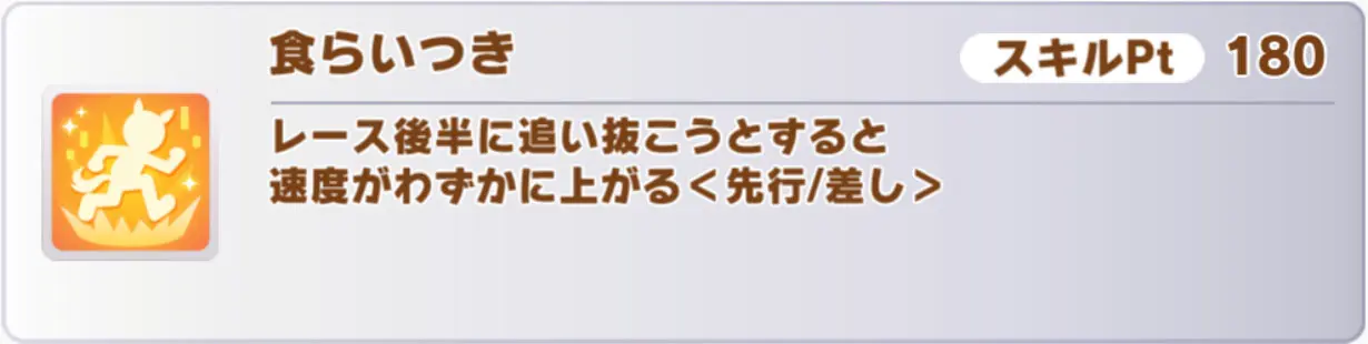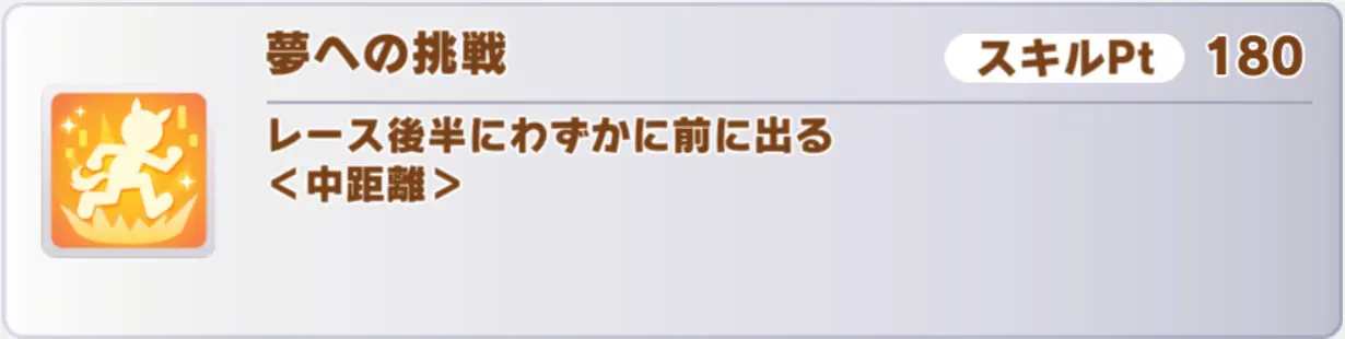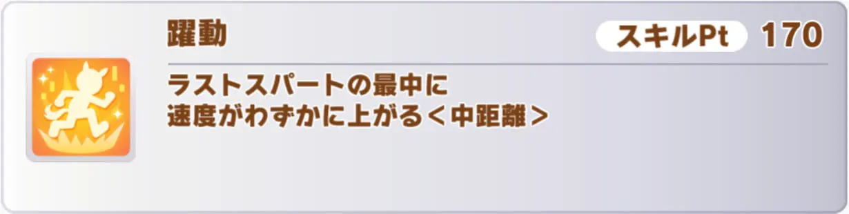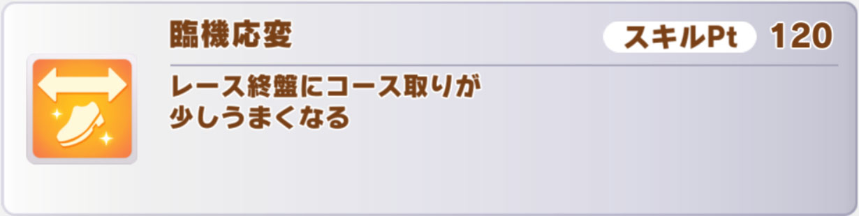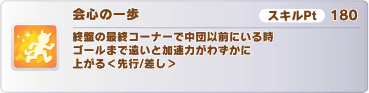 もはやおなじみ感がありますが、最終コーナー近くで終盤入りする中距離以上のコースで強いスキルで。具体的には東京芝2000m、東京芝2400mなどが対象になりますね。この条件に該当するコースでは、ぜひとも欲しいスキルの1つです。