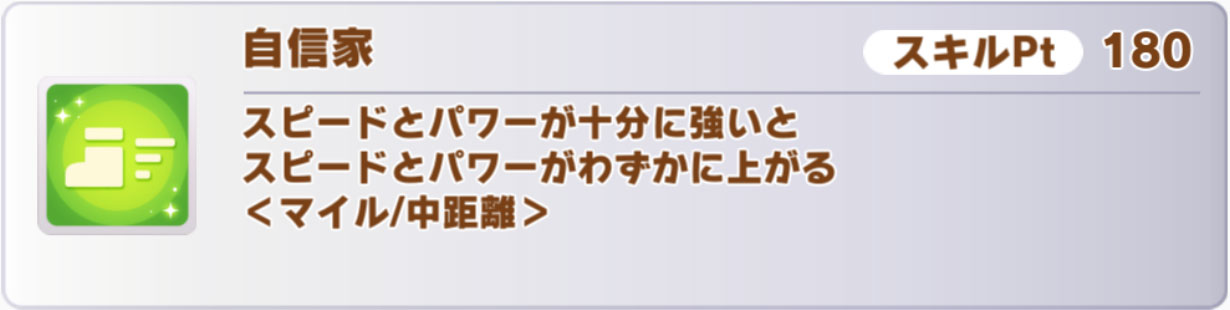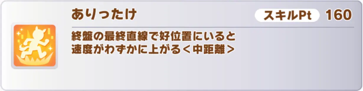 「中距離直線◯」「中距離コーナー◯」「ありったけ」などの優秀なスキルを取れるので、中距離用の育成では重宝しそう。先行/差し向けのスキルもありますが、そこまで数多くはないので、中距離育成なら全脚質で使えるかと思いますね。
