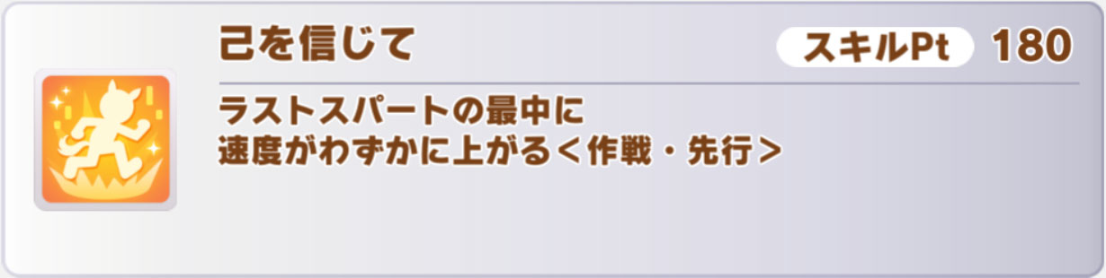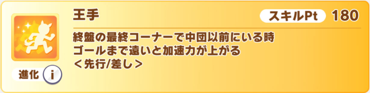 現在速度アップでいつ発動しても問題なく、かなり使いやすい強めのスキルかと思います。「王手」が強くないコースや先行/差し以外の育成ではこちらを選びましょう。