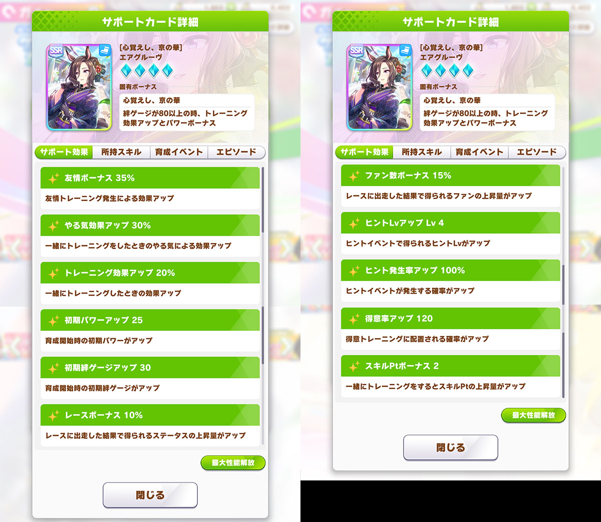 加えて、ヒントLvアップ Lv4で、スキルヒントをLv5でもらえるのは熱いですね。スピードボーナスこそないですが、全体的にサポート効果はかなり優秀です。