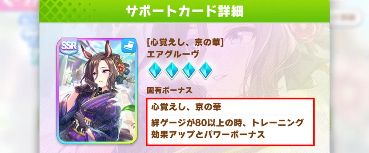 固有ボーナスは、「絆ゲージが80以上の時、トレーニング効果アップ5%とパワーボーナス1」