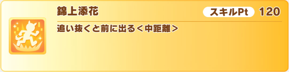 選択式のうち2つ目は、中距離専用の現在速度スキル「錦上添花」です。発動条件が「開始5秒後以降に追い抜く」なので、序盤~中盤にかけて発動しそうですね。