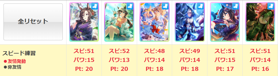 見てのとおり、その練習性能はスピテイオー級です。スピ盛り性能では負けていますが、パワ盛り性能では上回り、スキルPt盛り性能は同等。ほかのサポートと比較しても間違いなく現環境で最上位といえる超絶性能です。