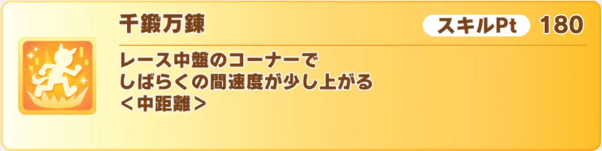 固定になるのが、中距離専用の中盤スキル「千鍛万錬」。こちらは最高速度アップ2500/4秒で、中距離版の「ネバーギブアップ」といえる効果になっています。距離限定になったとはいえ、かなり強力なスキルといえるのかなと思いますね。