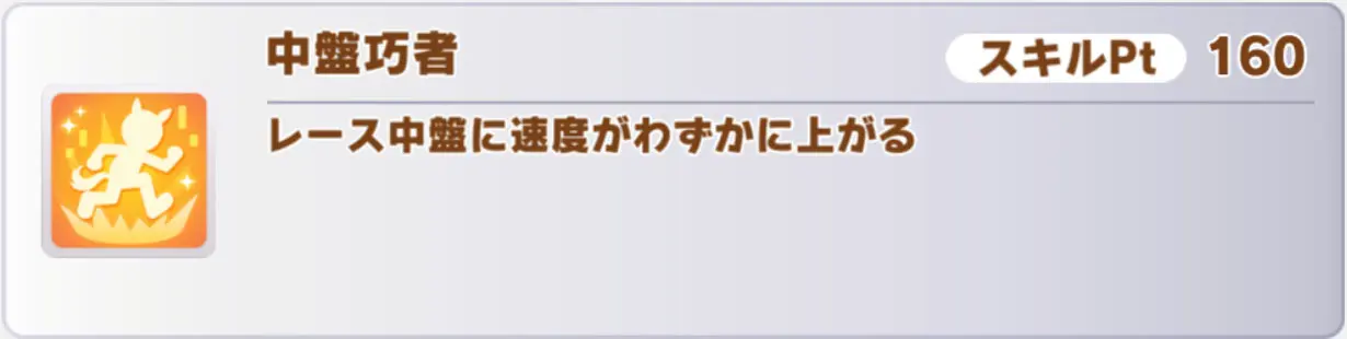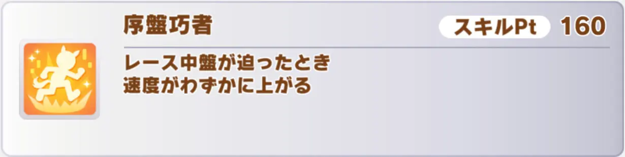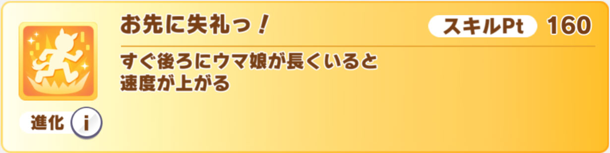 金スキル「お先に失礼っ!」はどの条件でも使える汎用速度スキル。逃げや先行などの前脚質だと特に発動を狙いやすく、3秒スキルなのも魅力的ですね。