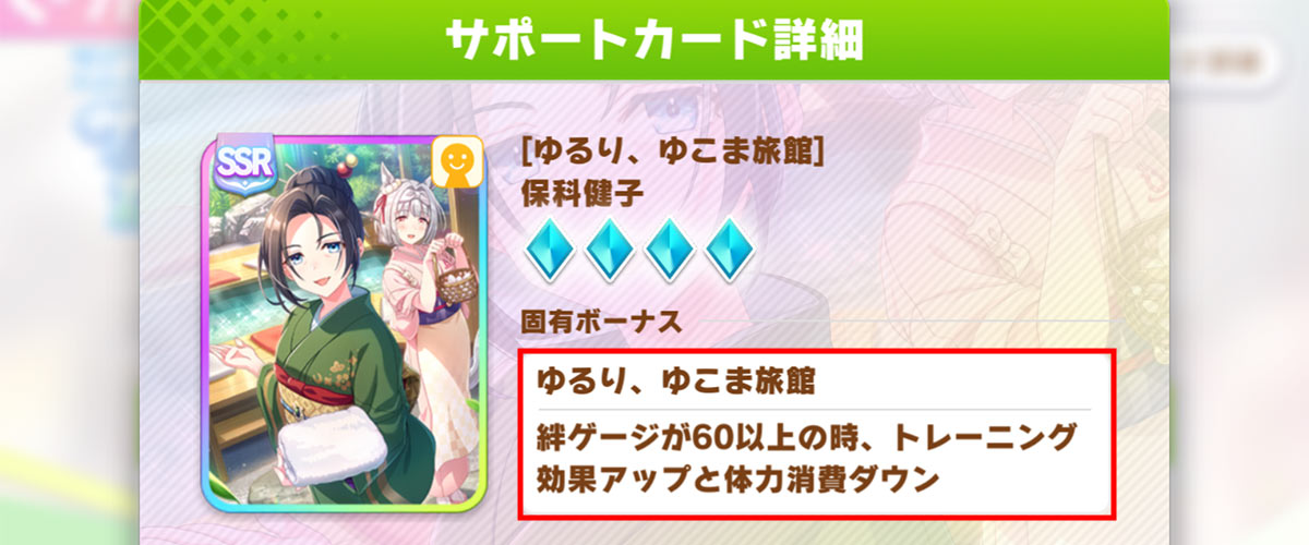 | Lv30 | ゆるり、ゆこま旅館 | 絆ゲージが60以上の時、トレーニング効果アップと体力消費ダウン |