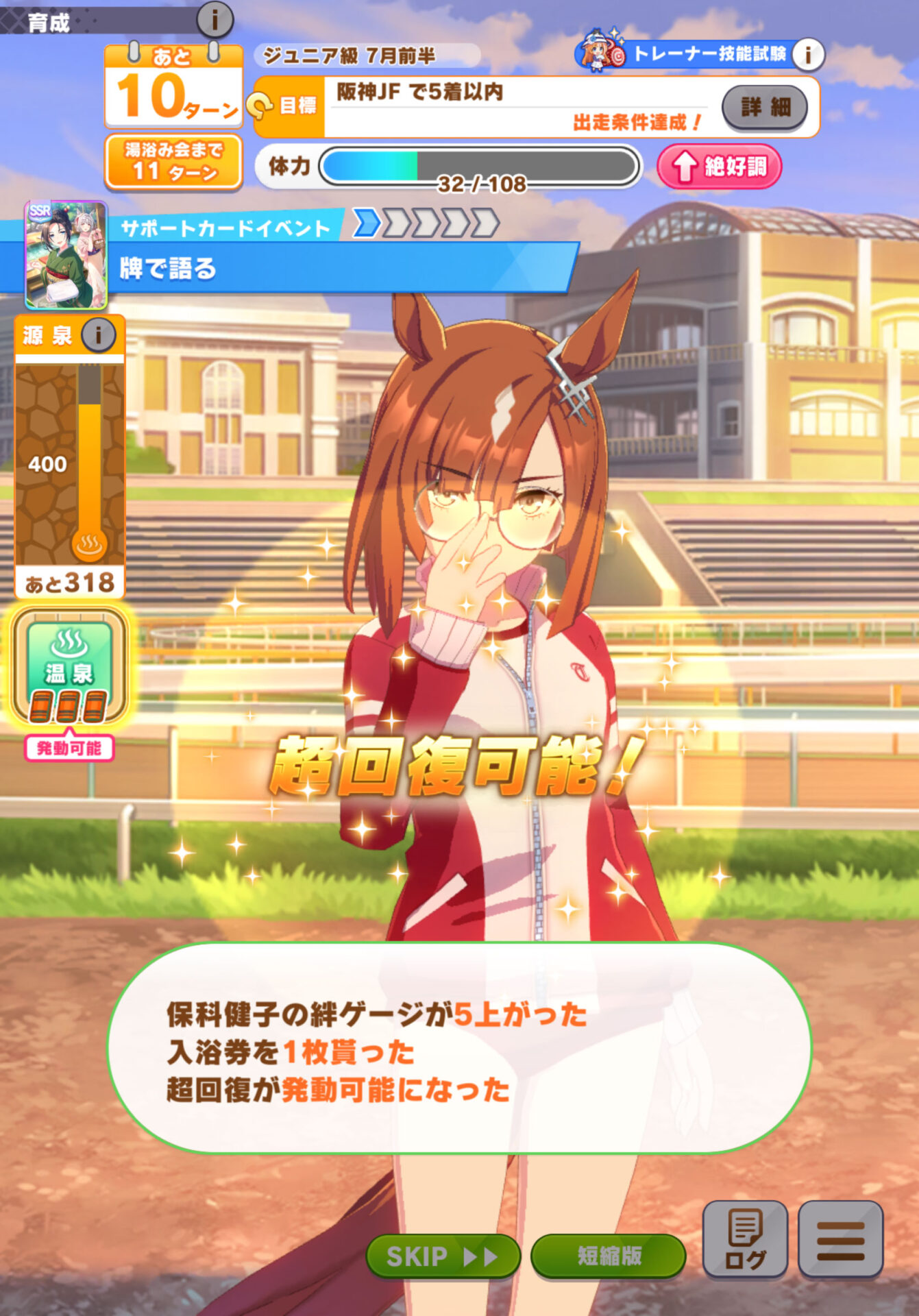 そのため、、基本的には超回復起動用として考えるのが良くて、その意味では畑シナリオの理事長に近い立ち位置。加えて入浴券も手に入るので、暇なときや超回復を起動したいときにお出かけする立ち回りが良いかと。