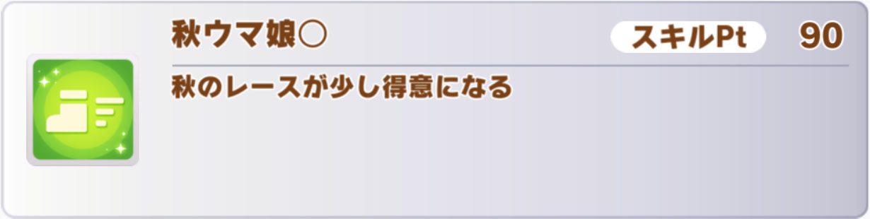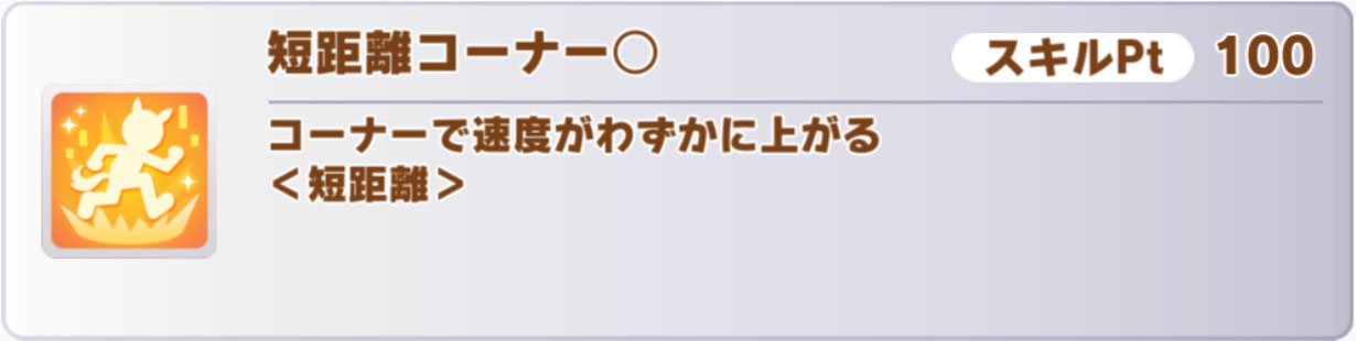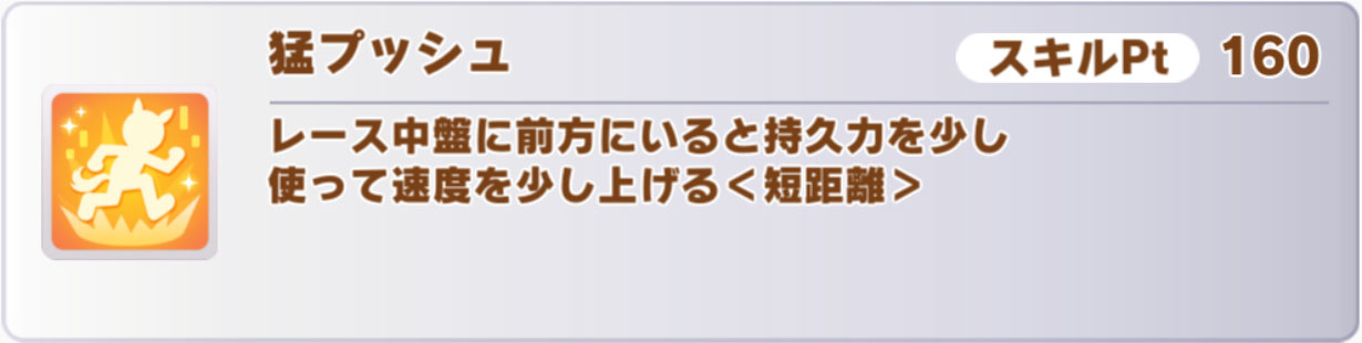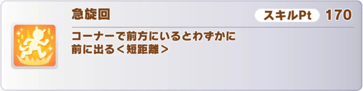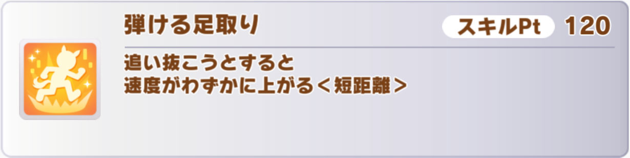 「短距離直線◯」「短距離コーナー◯」はもちろん、新スキル「猛プッシュ」はアグレッシブの短距離版でかなり強い。ほかにも「弾ける足取り」なんかはけっこうレアですね。