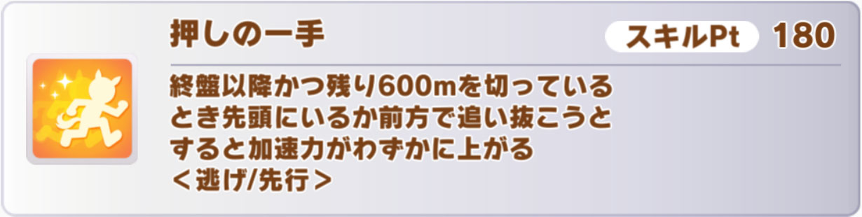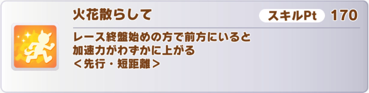 終盤加速スキルについても「押しの一手」をはじめ、逃げ・短距離専用の「譲れぬ一歩」、先行・短距離専用の「火花散らして」と、短距離の逃げ先行に欲しいものがしっかり揃っています。この辺の因子化が必要ないのは、かなり重宝しそうですね。