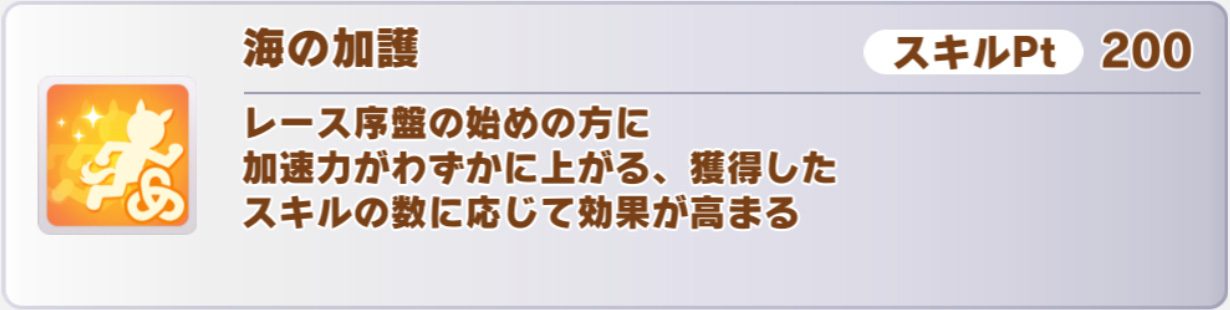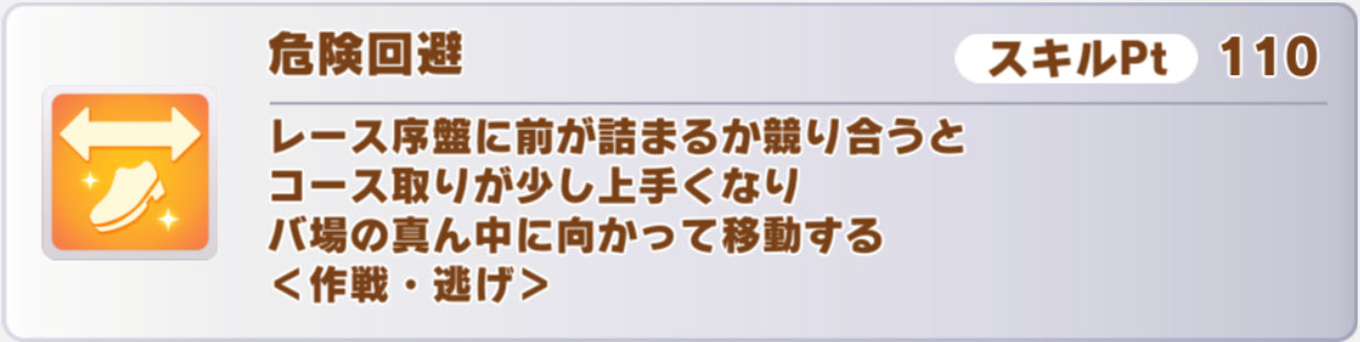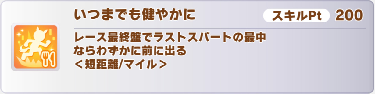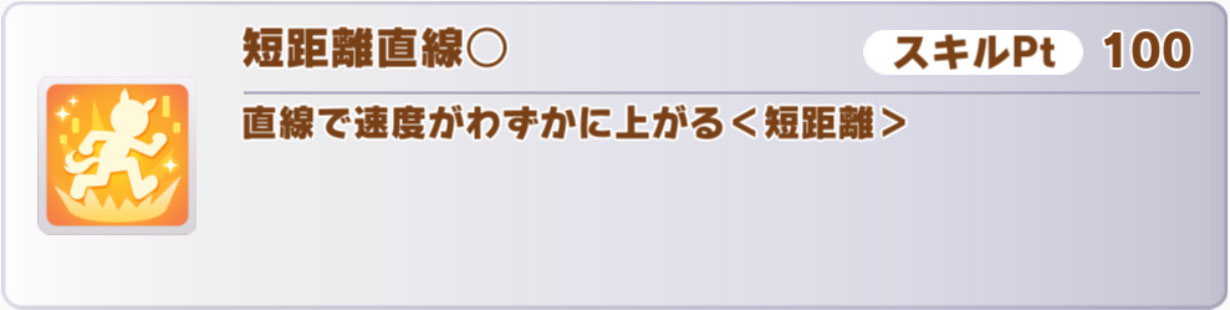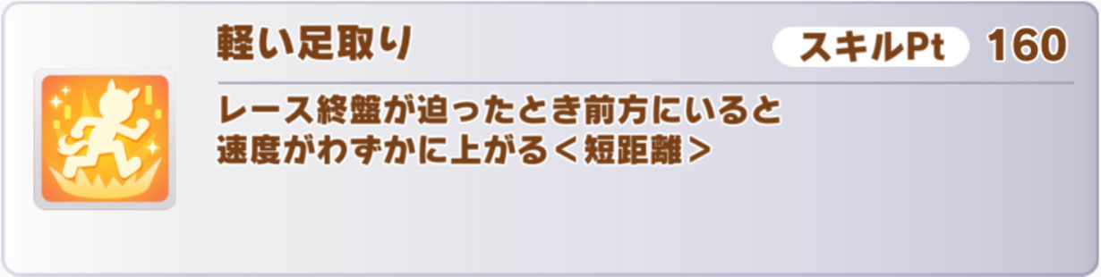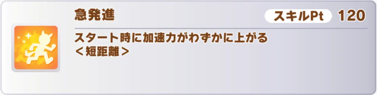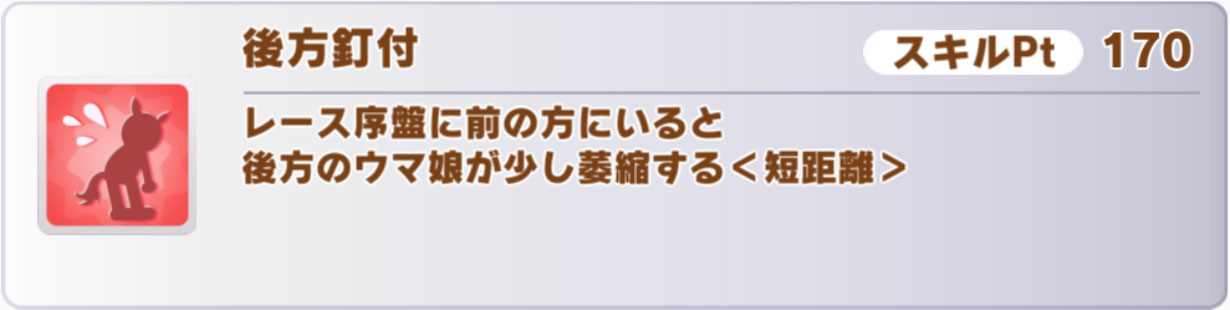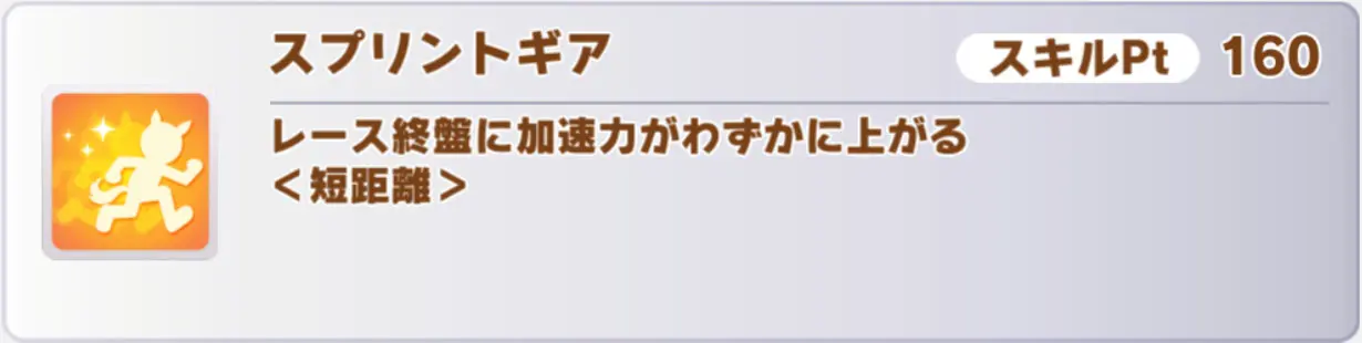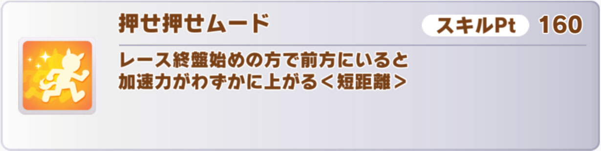 こちらは「押せ押せムード」の上位版で、「ハイボルテージ」の短距離版ですね。短距離は基本加速ゲーになるので、重要度高めのスキルになるかと思います。