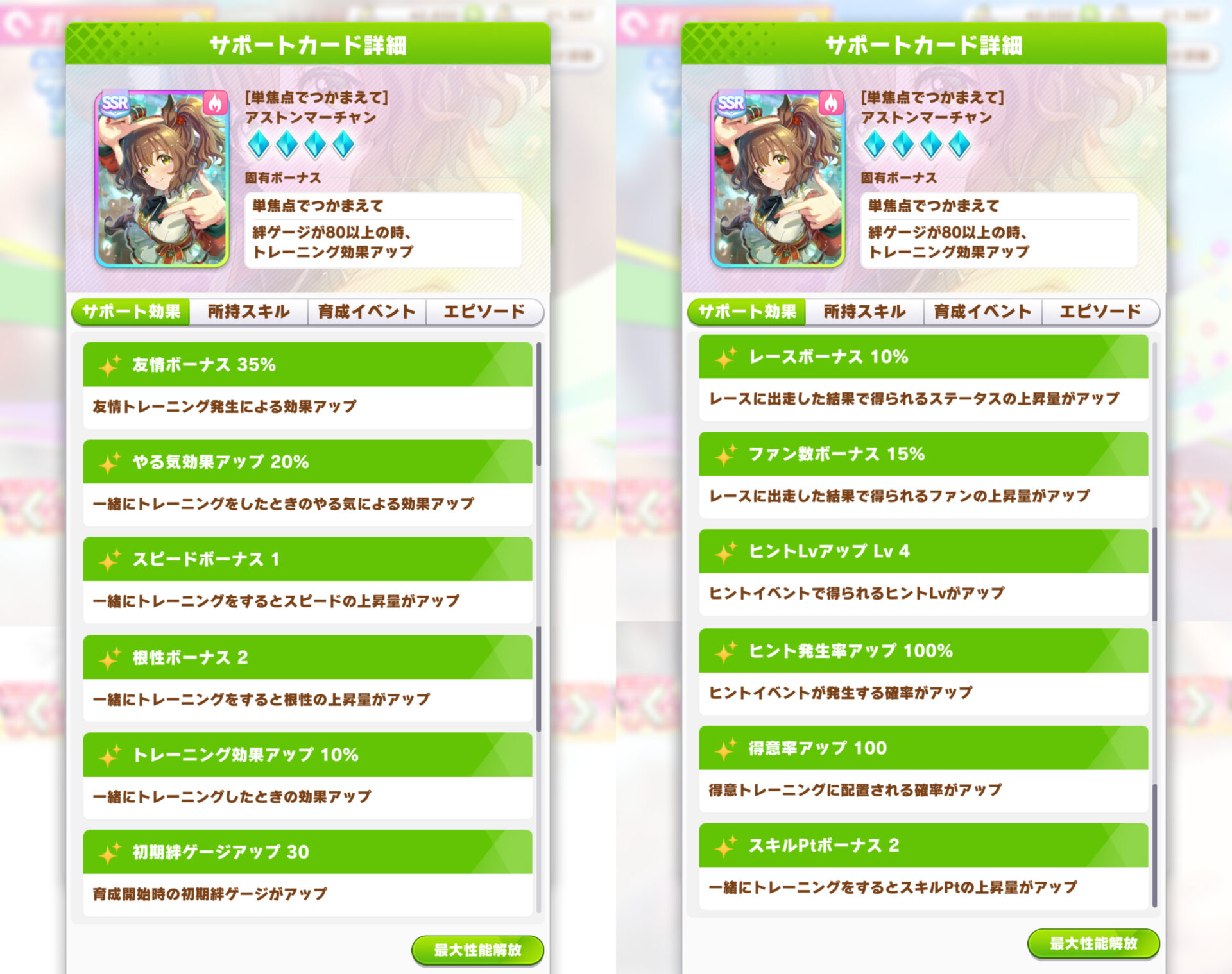 サポート効果はスキルPtボーナス2、ヒントLvアップ Lv4をはじめ、すべてが強い
