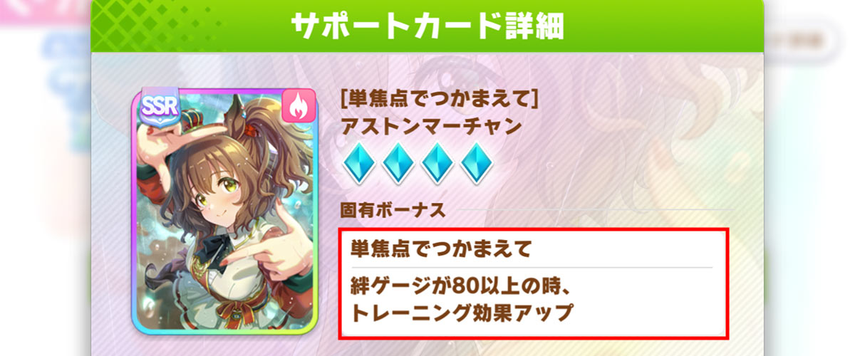 SSRアストンマーチャン(根性)の固有ボーナスは、「絆ゲージが80以上の時、トレーニング効果アップ10%」です。