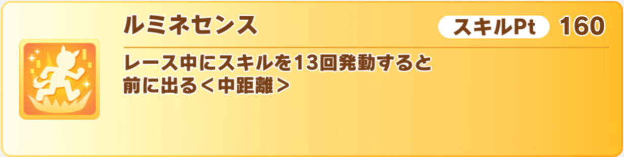 このサポートは金スキル2個を1度に取れるタイプで、1個目は中距離専用の現在速度スキル「ルミネセンス」です。