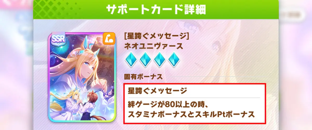 SSRネオユニヴァース(パワー)の固有ボーナスは「絆ゲージが80以上の時、スタミナボーナス1とスキルPtボーナス1」です。