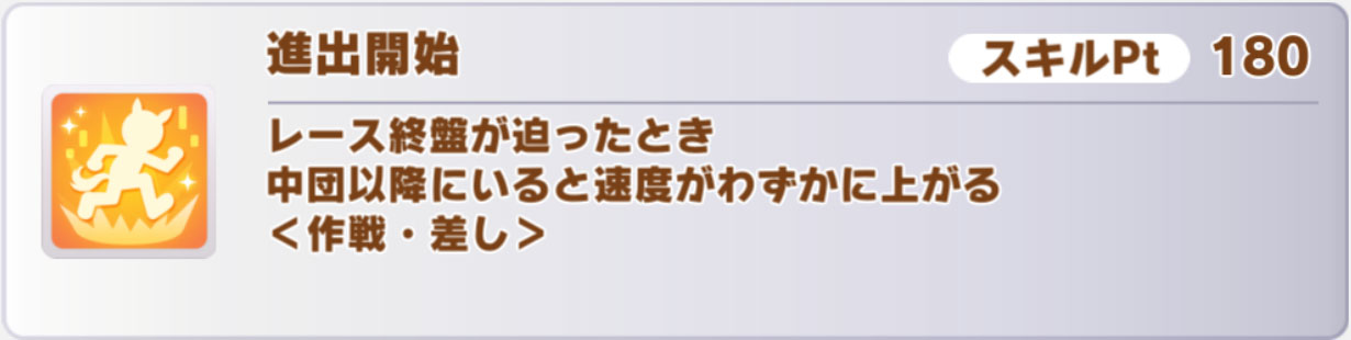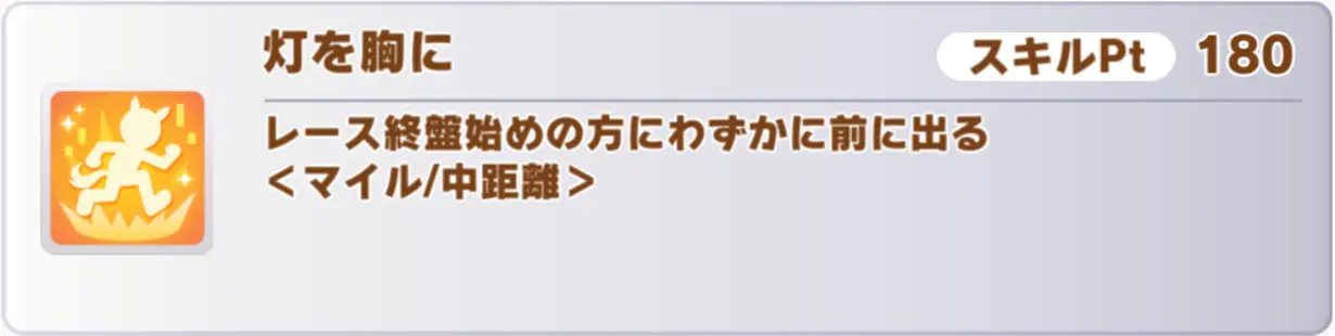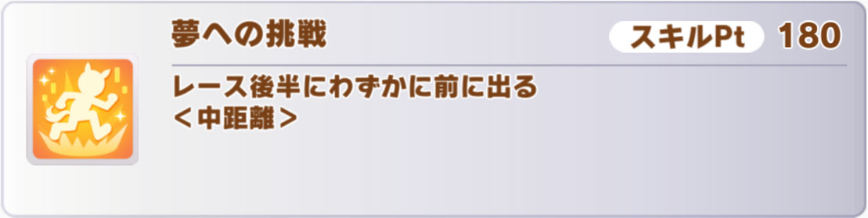 具体的には「ありったけ」「夢への挑戦」「灯を胸に」などですが、「ワンチャンス」など後ろ脚質向けのスキルもあります。