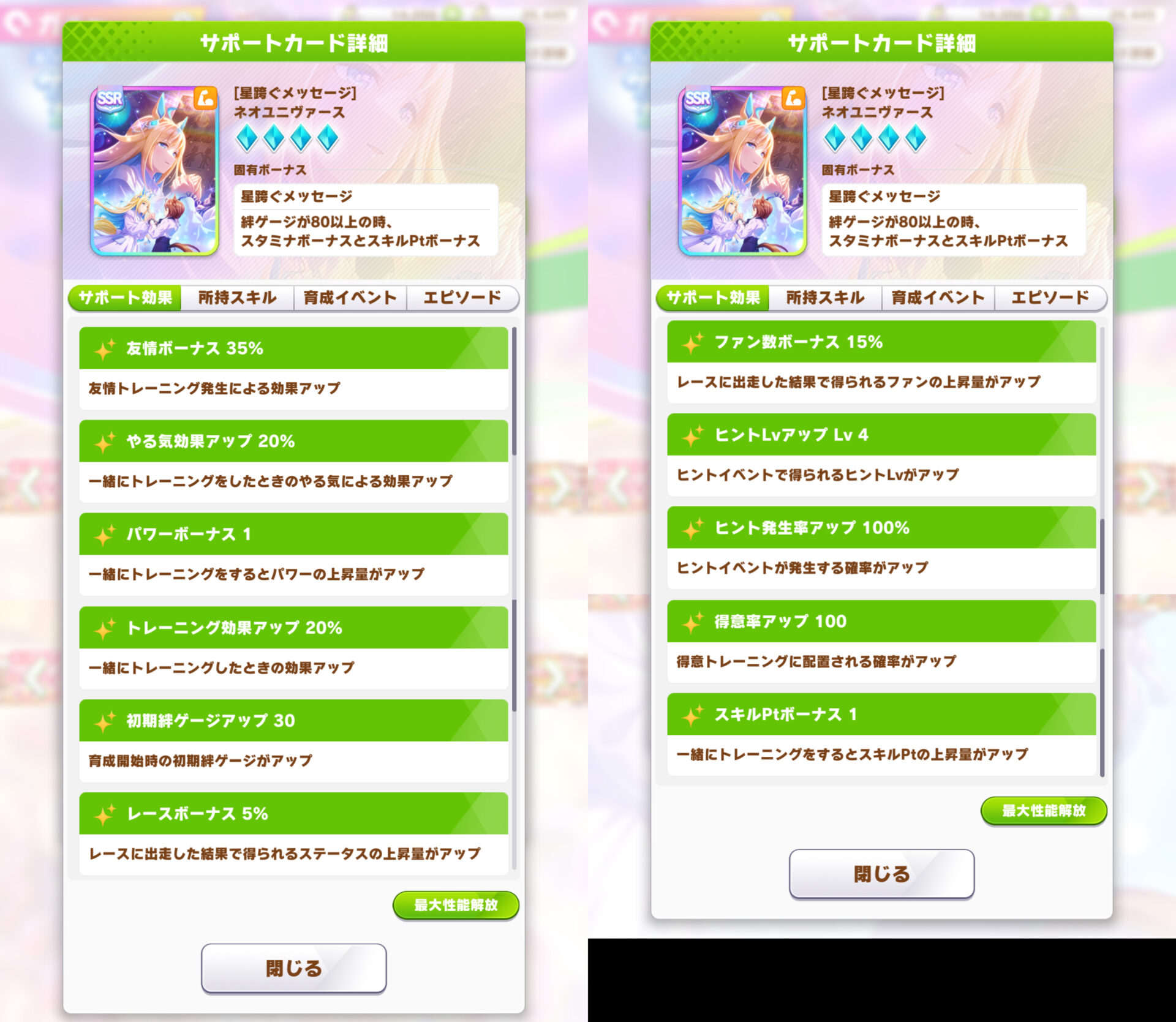 SSRネオユニヴァース(パワー)のサポート効果は以上の通り。先ほどの固有込みだとスキルPtボーナス2になるほか、トレーニング効果アップ20%、友情ボーナス35%など優秀な効果がついています。
