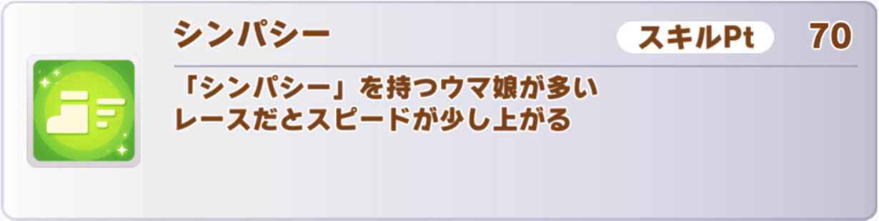 こちらは、単純に最高速度アップ2500/4秒に3.5%回復がついてくるのがめちゃくちゃ強い。これまではSSRスティルインラブ(スピード)の専売特許でしたが、これを取れるというのは中距離戦においては大きなアドバンテージになりそうです。