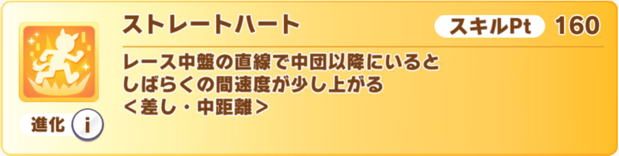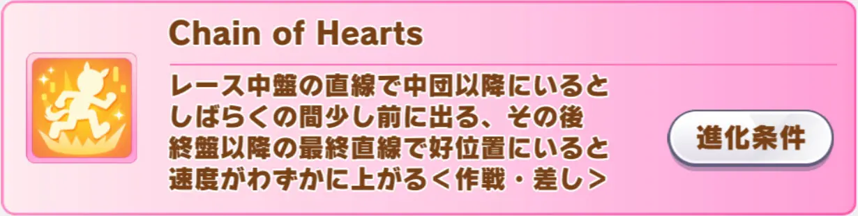 覚醒Lv3は差し・中距離専用の中盤直線スキル「ストレートハート」で、進化スキルは距離条件が消えつつ最終直線の効果が加わった「Chain of Hearts」。